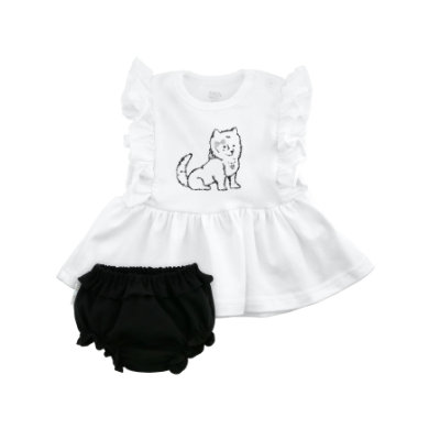 Das Herzstück dieses Sets ist das wunderschöne Kleidchen. Gefertigt aus einem weichen, hautfreundlichen Material, garantiert es ein angenehmes Tragegefühl auf der zarten Babyhaut. Der Schnitt ist liebevoll auf die Bedürfnisse von Babys abgestimmt und bietet ausreichend Bewegungsfreiheit zum Strampeln und Entdecken. Das Design besticht durch seine schlichte Eleganz, die durch feine Details wie zarte Rüschen, eine kleine Schleife oder eine dezente Stickerei einen Hauch von Glamour erhält. Die klassischen Farben Weiß und Schwarz harmonieren perfekt miteinander und machen das Kleid zu einem zeitlosen Hingucker. Ob für einen festlichen Anlass oder einen gemütlichen Nachmittag zu Hause – mit diesem Kleid ist Ihr kleiner Schatz immer perfekt gekleidet.