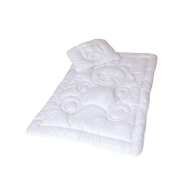 Guter Schlaf ist ein wichtiger Beitrag für die Entwicklung eines Kindes. Kleinkinder haben durch ihr intensives Wachstum einen höheren Stoffwechsel und schwitzen schneller als Erwachsene. Alle Kinder- und Babybetten sind aus diesem Grund sehr leicht, atmungsaktiv und dabei trotzdem wohlig wärmend. Produktdetails: Bärchensteppung Sehr leicht und atmungsaktiv Geeignet für Allergiker Zertifiziert nach Öko-Tex Standard 100 – A11-1030 in Hohenstein HTTI Technische Details: Maße: Breite x Länge 40 x 60 / 100 x 135 cm Material Bezug: 100% Polyester, Mikrofaser material Füllung: 100% Polyester Füllgewicht: Decke ca. 500g / Kissen ca. 100g Im Lieferumfang enthalten: Bettdecke Kopfkissen