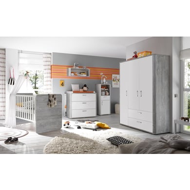 Das Kinderzimmer Frieda überzeugt durch moderne Optik, pflegeleichte Oberflächen sowie eine komfortable Türdämpfung und Schubladen mit Selbsteinzug. Die Möbel zeichnen sich durch viel Stauraum aus, sodass alles seinen Platz findet. Technische Details: Made in Germany Garantiert Nachhaltig Kinderbett Farbe: vintage wood grey / weiß matt Material Gestell: Spanplatte, melaminbeschichtet Material Lattenrost: Buche massiv, lackiert Liegefläche: Breite x Länge 70 x 140 cm Maße: Breite x Länge x Höhe 78 x 144 x 93 cm 3-fach verstellbares Rost 3 Schlupfsprossen Umbaubar zum Juniorbett Wickelkommode Farbe: vintage wood grey / weiß matt Material: Spanplatte, melaminbeschichtet Maße ohne Wickelaufsatz: Breite x Tiefe x Höhe 110 x 44 x 93 cm Maße mit Wickelaufsatz: Breite x Tiefe x Höhe 110 x 72 x 98 cm Wickelfläche: Breite x Tiefe 87 x 71 cm Wickelhöhe: 93 cm Wickelaufsatz abnehmbar Extra hohe Sicherungsleisten 3 Schubladen mit Selbsteinzug Kleiderschrank Farbe: vintage wood grey / weiß matt Material: Spanplatte, melaminbeschichtet Maße: Breite x Tiefe x Höhe 138 x 51 x 189 cm 2 Schubladen mit Selbsteinzug 3 Türen mit Dämpfung 1 Kleiderstange 5 Einlegeböden Standregal Farbe: vintage wood grey / weiß matt Material: Spanplatte, melaminbeschichtet Maße: Breite x Tiefe x Höhe 55 x 41 x 128 cm 1 Tür 2 Einlegeböden 2 offene Fächer Hängeregal Farbe: vintage wood grey / weiß matt Material: Spanplatte, melaminbeschichtet Maße: Breite x Tiefe x Höhe 90 x 32 x 31 cm Unterstellregal Farbe: weiß matt Material: Spanplatte, melaminbeschichtet Maße: Breite x Tiefe x Höhe 25 x 25 x 89 cm 3 offene Fächer Umbauseiten Farbe: weiß matt Material: Spanplatte, melaminbeschichtet Maße: Breite x Länge x Höhe 16 x 139 x 2 cm Im Lieferumfang enthalten: Kinderbett Lattenrost Kommode Wickelaufsatz Kleiderschrank Standregal Hängeregal Unterstellregal Umbauseiten Achtung: Dekoration und Matratze sind nicht im Lieferumfang enthalten