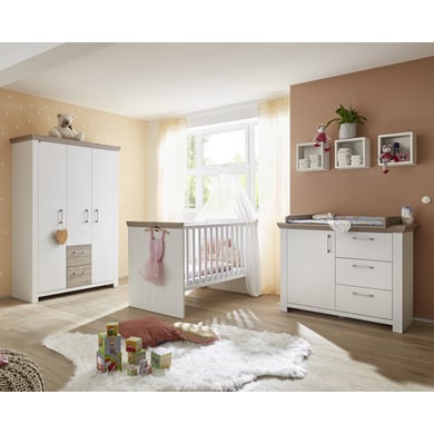 Das Kinderzimmer New York überzeugt durch zeitlose Optik, pflegeleichte Oberflächen sowie eine komfortable Türdämpfung und Schubladen mit Selbsteinzug. Die Möbel zeichnen sich durch viel Stauraum aus, sodass alles seinen Platz findet. Technische Details: Made in Germany Garantiert Nachhaltig Kinderbett Farbe: anderson pine / nelson eiche Material Gestell: Spanplatte, melaminbeschichtet Material Seitenteile und Lattenrost: Buche massiv, lackiert Liegefläche: Breite x Länge 70 x 140 cm Maße: Breite x Länge x Höhe 78 x 149 x 93 cm 3-fach verstellbares Rost Seitenteile mit breiten Sprossen Der Korpus hat ABS-Kanten Umbaubar zum Juniorbett Wickelkommode Farbe: anderson pine / nelson eiche Material: Spanplatte, melaminbeschichtet Maße ohne Wickelaufsatz: Breite x Tiefe x Höhe 117 x 44 x 92 cm Maße mit Wickelaufsatz: Breite x Tiefe x Höhe 117 x 71 x 99 cm Wickelfläche: Breite x Tiefe 87 x 71 cm Wickelhöhe: 92 cm Wickelaufsatz abnehmbar 3 Schubladen mit Selbsteinzug 1 Tür mit Dämpfung 1 Einlegeboden Kleiderschrank Farbe: anderson pine / nelson eiche Material: Spanplatte, melaminbeschichtet Maße: Breite x Tiefe x Höhe 135 x 50 x 191 cm 2 feste Mittelböden 2 Kleiderstangen 3 Schubladen mit Selbsteinzug 3 Türen mit Dämpfung 3 Einlegeböden Umbauseiten Farbe: anderson pine Material: Spanplatte, melaminbeschichtet Maße: Breite x Länge x Höhe 16 x 139 x 2 cm Im Lieferumfang enthalten: Kinderbett Lattenrost Kommode Wickelaufsatz Kleiderschrank Umbauseiten Achtung: Hängeregale, Dekoration und Matratze sind nicht im Lieferumfang enthalten