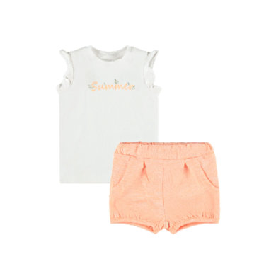Markenqualität aus dem Hause name it. Dieses schöne Set aus weicher Bio-Baumwolle besteht aus einem Top und einer Shorts. Das besonders weiche Material garantiert optimale Bewegungsfreiheit, eine sehr gute Passform und einen angenehmen Tragekomfort beim Spielen oder Toben. Das süße Top hat Rüschen an den Ärmelausschnitten, ein Motivprint auf der Vorderseite sowie Druckknöpfe an einer Schulter. Die Hose hat elastische Bündchen, Raffungen an der Taille und Eingriffstaschen für kleine Schätze. Produktdetails: Sommer-Set für Mädchen Rundhalsausschnitt Rüschenärmel Motivprint Elastische Bündchen Eingriffstaschen Material- und Pflegehinweise: Material: 95% Bio-Baumwolle, 5% Elasthan Maschinenwäsche bei max. 40 °C im Feinwaschprogramm Nicht bleichen Trockner nicht verwenden Zum Trocknen aufhängen Auf mittlerer Stufe bügeln
